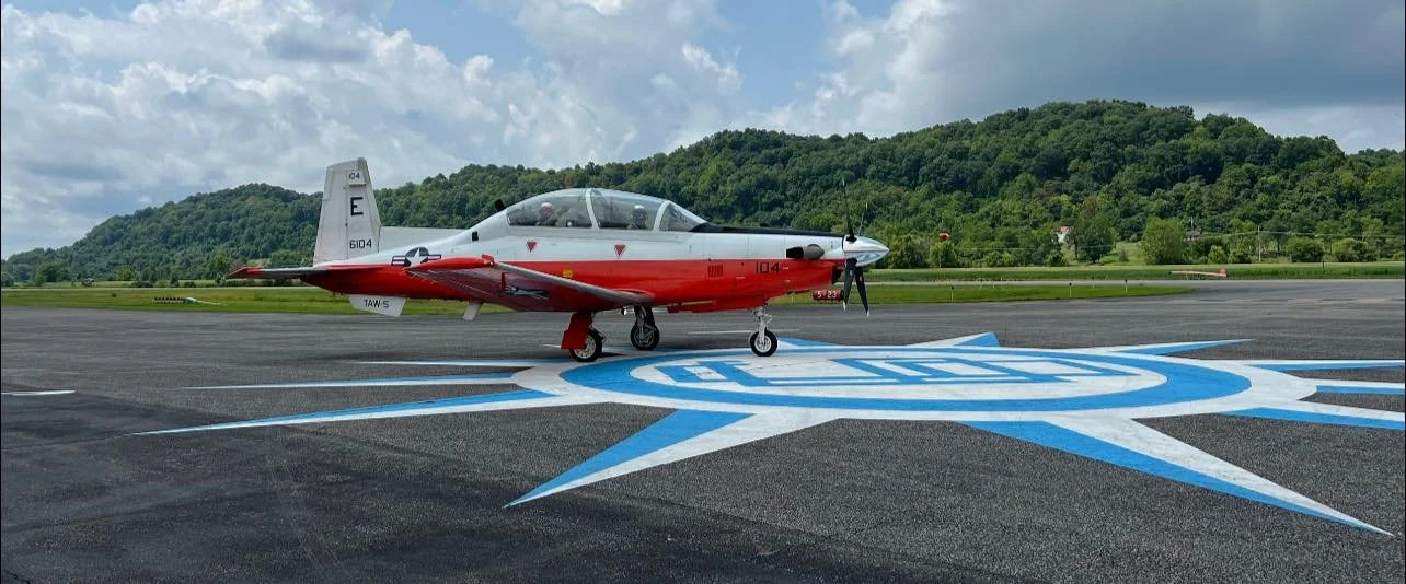 A US Navy T-6 Texan training aircraft readies for takeoff at the Gallia-Meigs Regional Airport.